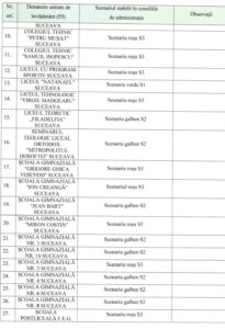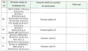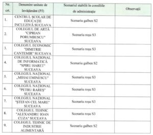Așa cum era de așteptat, pasarea responsabilității închiderii școlilor din municipiul Suceava către Consiliile de Administrație s-a lăsat cu un adevărat ghiveci. 15 școli vor funcționa după scenariul roșu, adică vor fi cursuri doar online, în 13 cazuri se merge pe scenariul galben, adică hibrid, dar sunt și trei școli care vor funcționa în scenariul verde, adică elevii vor fi față în față cu profesorii. În fotografiile atașate materialului puteți afla cum vor funcționa toate cele 31 de unități de învățământ din Suceava. Astăzi, luni, 2 noiembrie, rata de infectare cu Covid-19 era de 3,09 la mia de locuitori, în creștere față de zilele anterioare când municipiul Suceava avea 3,05 sâmbătă, respectiv 3,07 duminică. Și tot astăzi, cinci elevi de la diferite școli din municipiul Suceava au aflat că s-au infectat cu SARS-CoV2. Concluziile le las pe seama voastră.