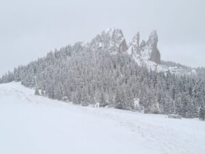 Februarie. Ziua Domnului 14. Anul 2021. Pietrele Doamnei și masivul Rarău emană mister. Sau poate e doar o himeră. Una care vine din vântul care suflă în rafale și cu putere. Drumul care șerpuiește prin apropierea Stației Meteo spre vârful Rarău se poate doar ghici. Zăpada spulberată în ultimele zile a acoperit traseul, unul care pe timp de vară nu poate fi catalogat ca fermecător. Acum, Pietrele Doamnei, ba apar, ba dispar din peisaj. Dar, așa e la munte pe timp de iarnă. În stânga este o construcție de lemn folosită de ciobani pe timp de vară. Acum este înconjurată de vălătuci de zăpadă. Iernile de altădată nu mai sunt doar o amintire. Clipele când nivelul gardului era drumul pe care mergeam de la casa bunicii la grădiniță mi-au revenit în memorie rapid. Am continuat să rup zăpada și am continuat urcarea spre vârful Rarău. Singur. La acea oră de amiază a zilei de duminică nimeni nu a avut curaj să se mai aventureze. Sus, la peste 1.600 de metri altitudine, vântul era stăpânul absolut. Îi mulțumesc ă mi-a permis să imortalizez zona înainte de a o ascunde din nou în falduri mari de gri și ceață misterioasă.